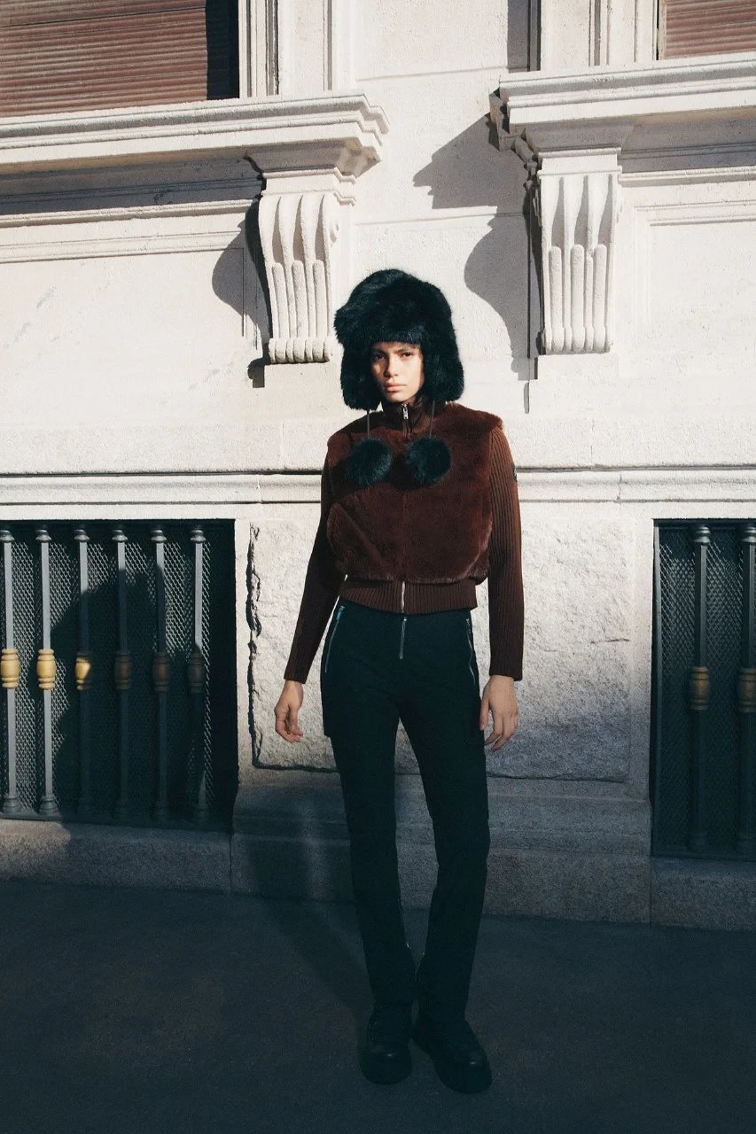 “I am seeing a lot of color and patterns everywhere. Bold and oversized sweaters that have vivid scenery and bold words. Colorful hats and gloves. Metallic puffer coats and vests that cinch in the waist seem to also be trending. Also, the old-school preppy prints are back — mixing patterns and super chic along with vibrant moon boots from the ‘80s. Lastly, mink slides in two tones. Chocolate and cream slides, natural color furs, and for those who take more risks, brighter fur slides as well.”